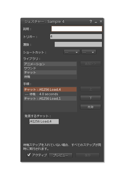 - 「手順」リストにチャットが追加されるので、「発言するチャット」欄にチャンネル番号とコマンドを入力します。
